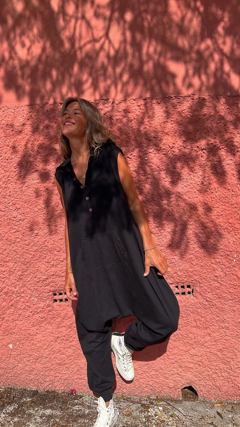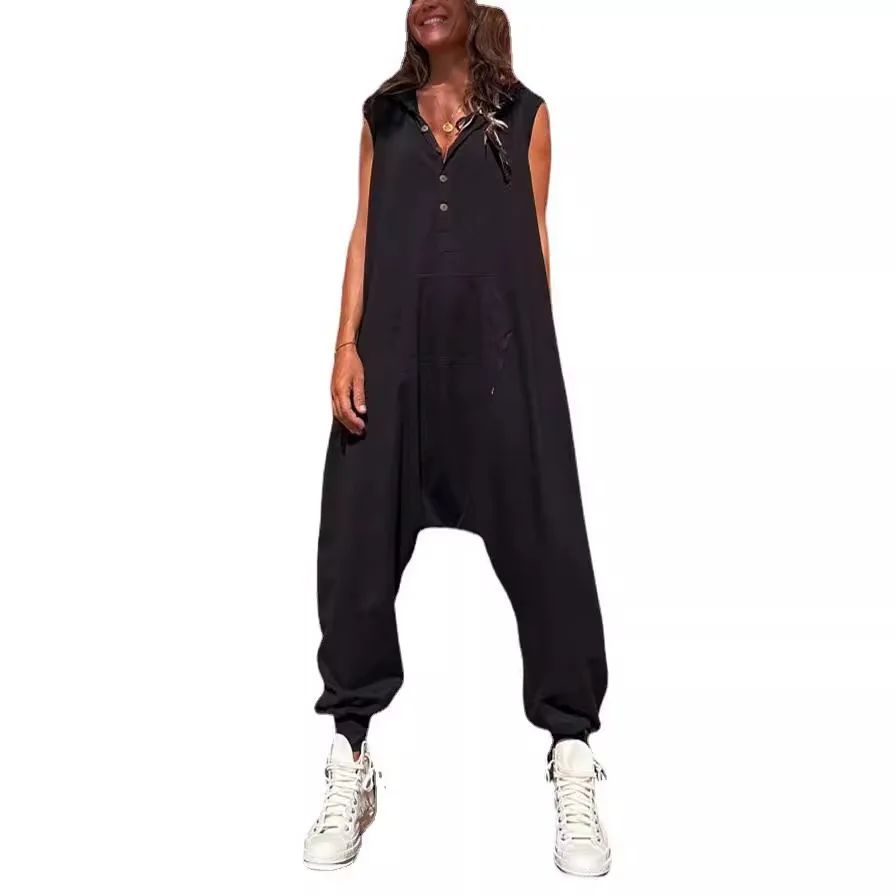 Combinaison d'été ample et décontractée à capuche sans manches, couleur unie, à la mode et personnalisée, boutonnée, pour femme, 2025 1